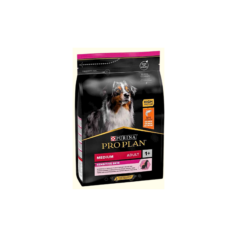 PURINA PRO PLAN Dog Medium Adulte Skin Sensible avec OPTIDERMA est un aliment sec pour chiens adultes ayant une peau sensible. Si votre chien de taille moyenne a la peau sensible, cet aliment complet pour chiens peut répondre à ses besoins et cibler sa sensibilité.