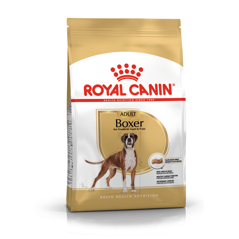 Le Boxer est un chien plein d’assurance, enjoué et intelligent. Il appartient également à l’une des races les plus athlétiques de l’espèce canine. Parce que chaque race est unique, il est important que l’alimentation de votre chien réponde à ses besoins spécifiques et l’aide à préserver son mode de vie unique et une santé optimale. ROYAL CANIN® Boxer Adult est spécialement formulé pour répondre à tous les besoins nutritionnels de votre chien adulte et convient aux Boxers âgés de 15 mois et plus. Les Boxers sont bien connus pour leur dynamisme, les chiens de cette race ne relâchent jamais leurs efforts une fois qu’ils ont commencé une activité physique. Par conséquent, leur corps est soumis à rude épreuve, et les Boxers ont besoin d’une alimentation adaptée à leurs intenses degrés d’activité. C’est pourquoi ROYAL CANIN® Boxer Adult contribue à renforcer la masse musculaire de votre chien grâce à une teneur adaptée en protéines et en L-Carnitine. ROYAL CANIN® Boxer Adult contient également des nutriments spécifiques, tels que la taurine, l’EPA et le DHA, pour favoriser une bonne fonction cardiaque. De plus, son complexe exclusif d’antioxydants aide à neutraliser les radicaux libres et renforce les défenses naturelles de votre chien. Les croquettes de ROYAL CANIN® Boxer Adult sont exclusivement conçues pour faciliter la prise de nourriture par votre chien, mais également pour l’encourager à la mâcher suffisamment avant de l’avaler.