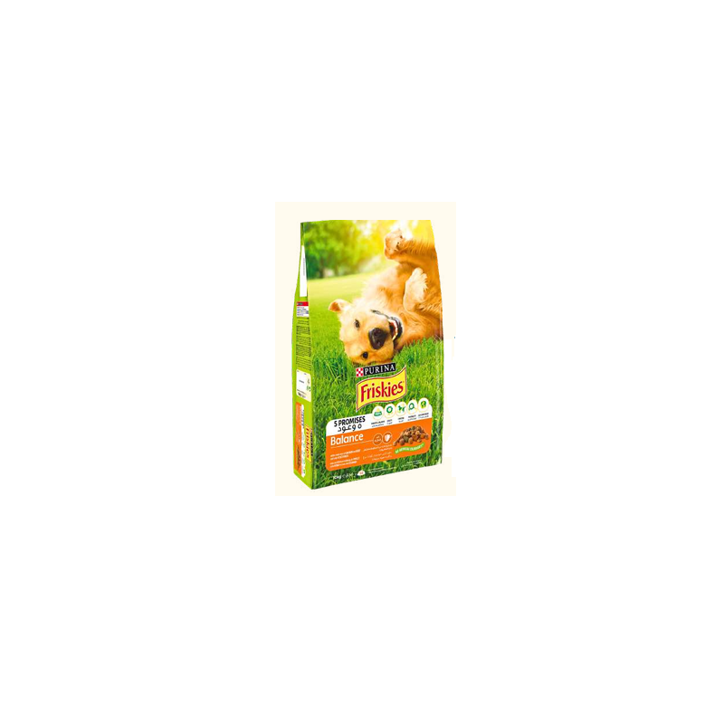 PURINA® FRISKIES® Balance est une savoureuse recette avec un délicieux mélange de Poulet et de Bœuf et avec des légumes, des céréales complètes, des vitamines B et des acides gras Oméga 3 & 6.